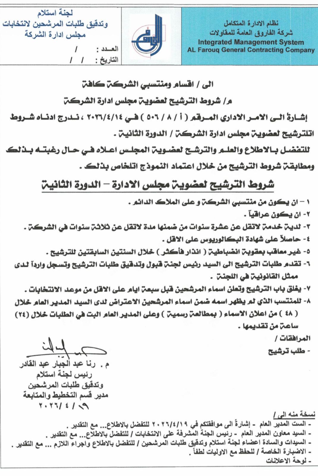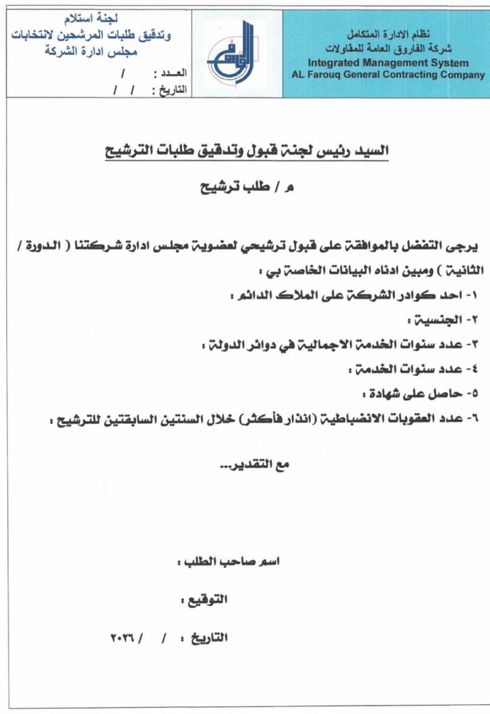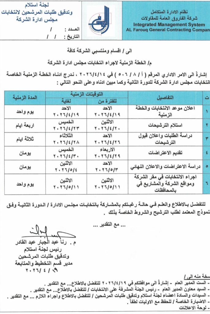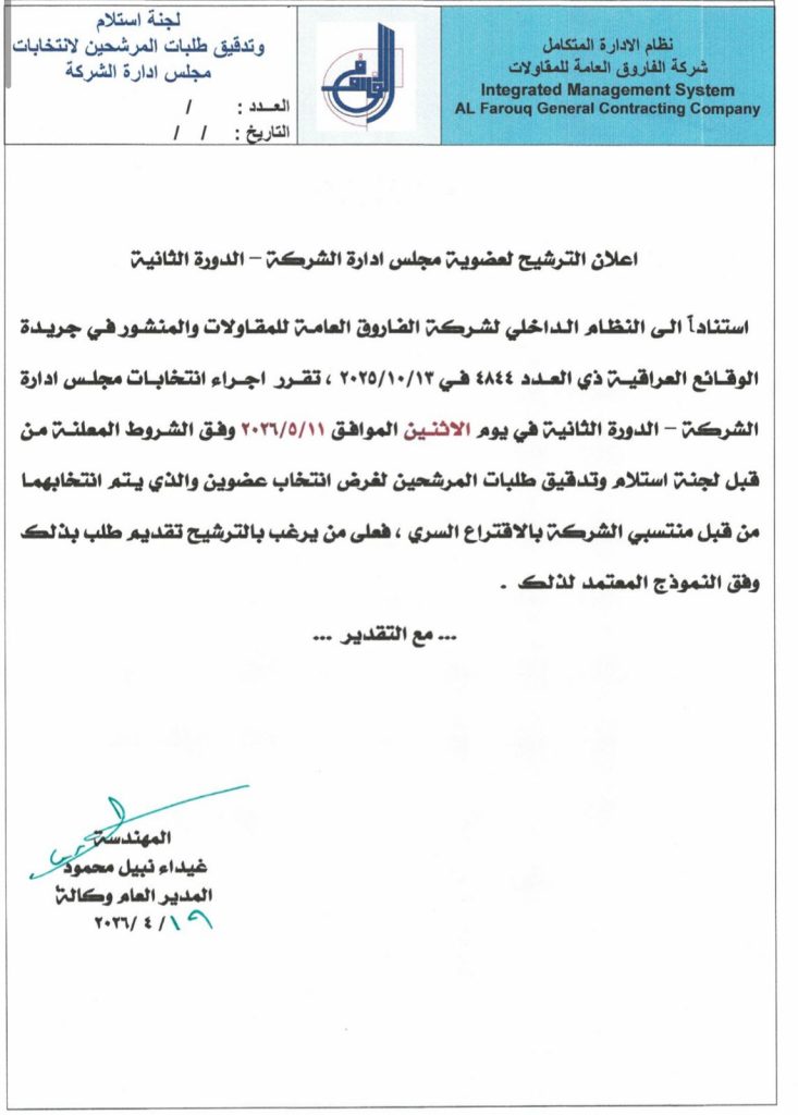 ‏استنادا إلى النظام الداخلي لشركة الفاروق العامة للمقاولات ، إحدى تشكيلات وزارة الأعمار والإسكان والبلديات العامة ، والمنشور في جريدة الوقائع العراقية ذي العدد 4844 في 13‏/10‏/2025 ، تقرر إجراء انتخابات مجلس إدارة الشركة _الدور الثانية ، في يوم الإثنين الموافق 11‏/5‏/2026 ، وفق الشروط المعلنة من قبل لجنة استلام وتدقيق طلبات المرشحين لغرض انتخاب عضوين والذي يتم انتخابهما من قبل منتسبي الشركة الاقتراع السري فعلى من يرغب بالترشيح تقديم طلب بذلك وفق النموذج المعتمد .