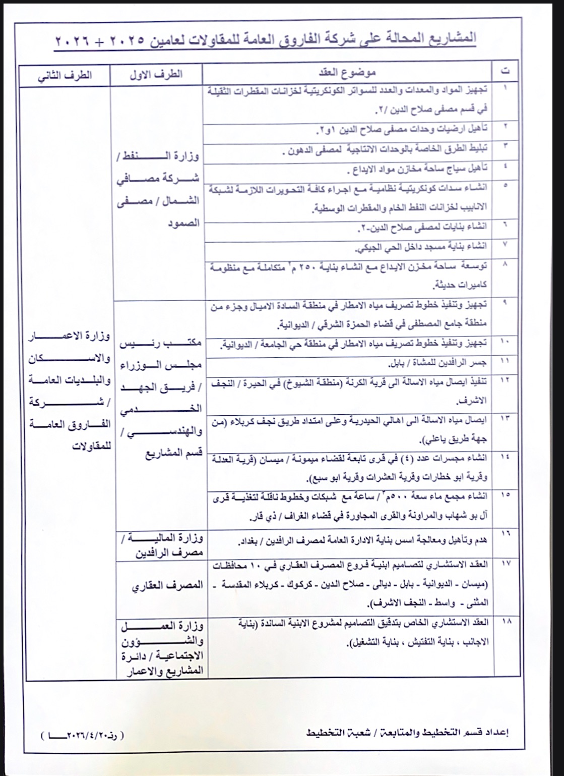 المشاريع المحالةعلى شركة الفاروق العامة للمقاولات 2025+2026